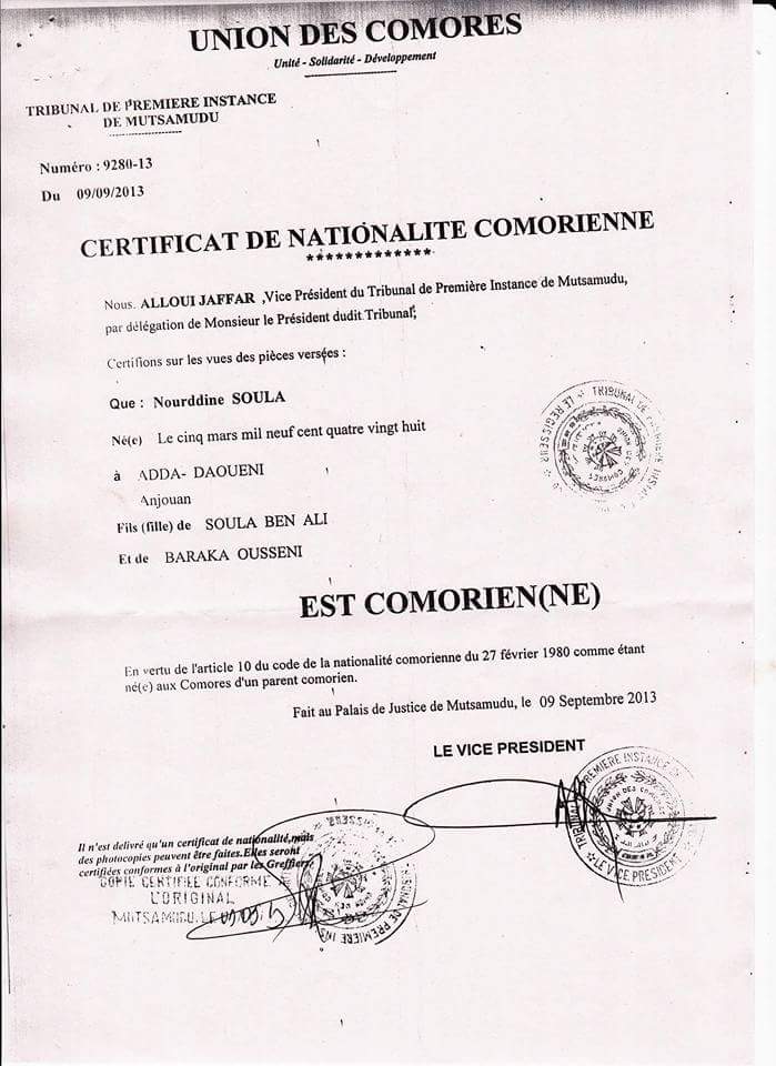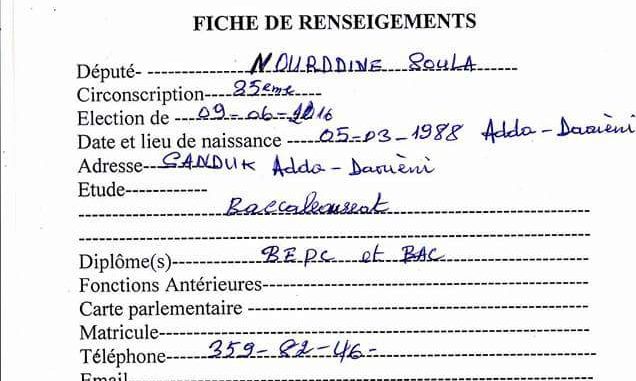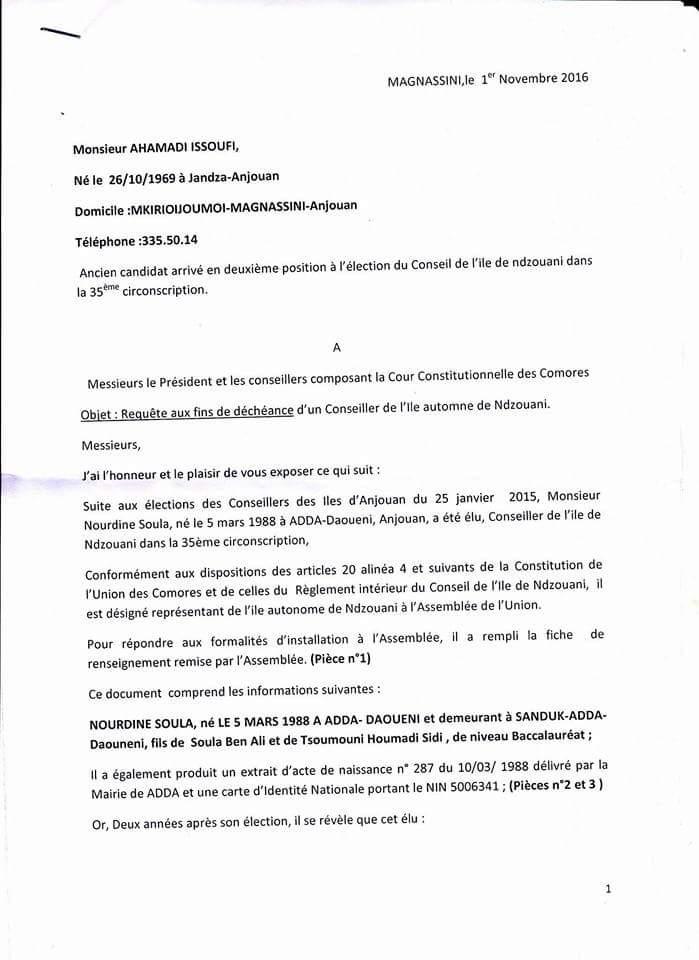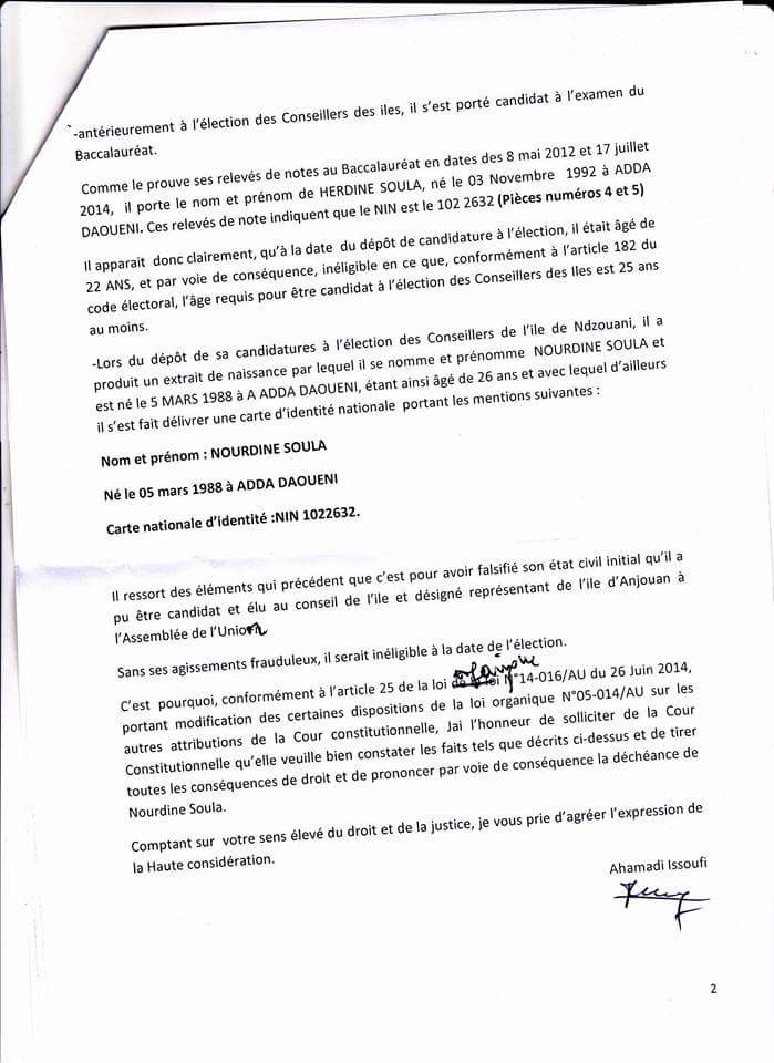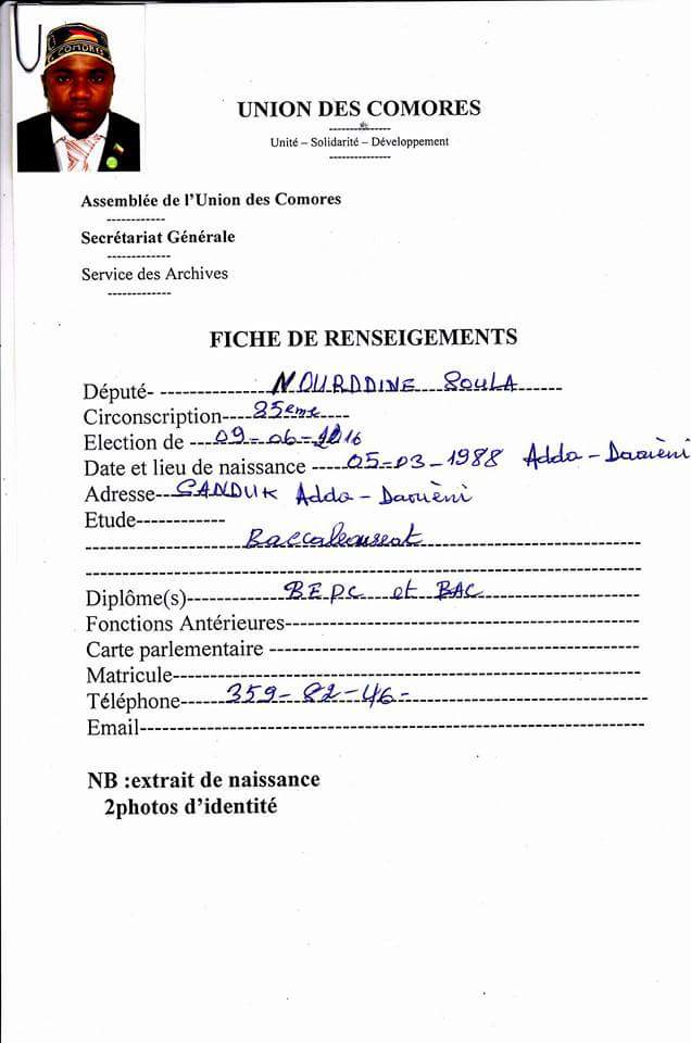 Le conseiller de l’île d’Anjouan, élu en 2015, est passé au rand de député. Ceci en violation de l’article 182 du code électoral qui requiert l’âge de 25 ans pour être candidat. Or, il en avait 22 ans lors de l’élection du 25 janvier 2015. Voir ci dessous.