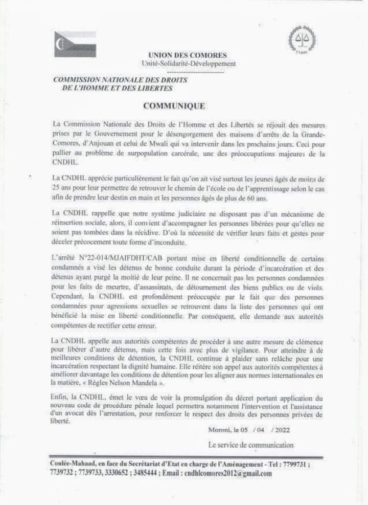 « L’arrêté N°22-014/MJAIFDHT/CAB portant mise en liberté conditionnelle de certains condamnés a visé les détenus de bonne conduite durant la période d’incarcération et des détenus ayant purgé la moitié de leur peine. Il ne concernait pas les personnes condamnées pour les faits de meurtre, d’assassinats, de détournement des biens publics ou de viols. Cependant, la CNDHL est profondément préoccupée par le fait que des personnes condamnées pour agressions sexuelles se retrouvent dans la liste des personnes qui ont bénéficié la mise en liberté conditionnelle. Par conséquent, elle demande aux autorités compétentes de rectifier cette erreur. »