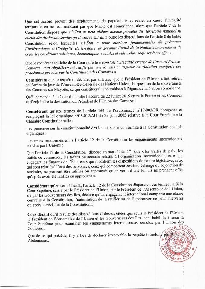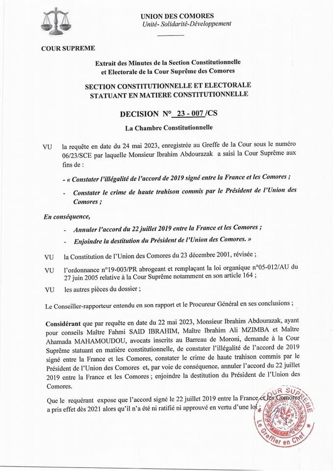 Dans une décision marquante, la Section Constitutionnelle de la Cour Suprême des Comores a rejeté aujourd’hui la requête déposée par le Front Commun, qui demandait la destitution du Président Azali Assoumani pour haute trahison. Cette requête faisait suite à la signature de l’accord historique de 2019 entre la France et les Comores.