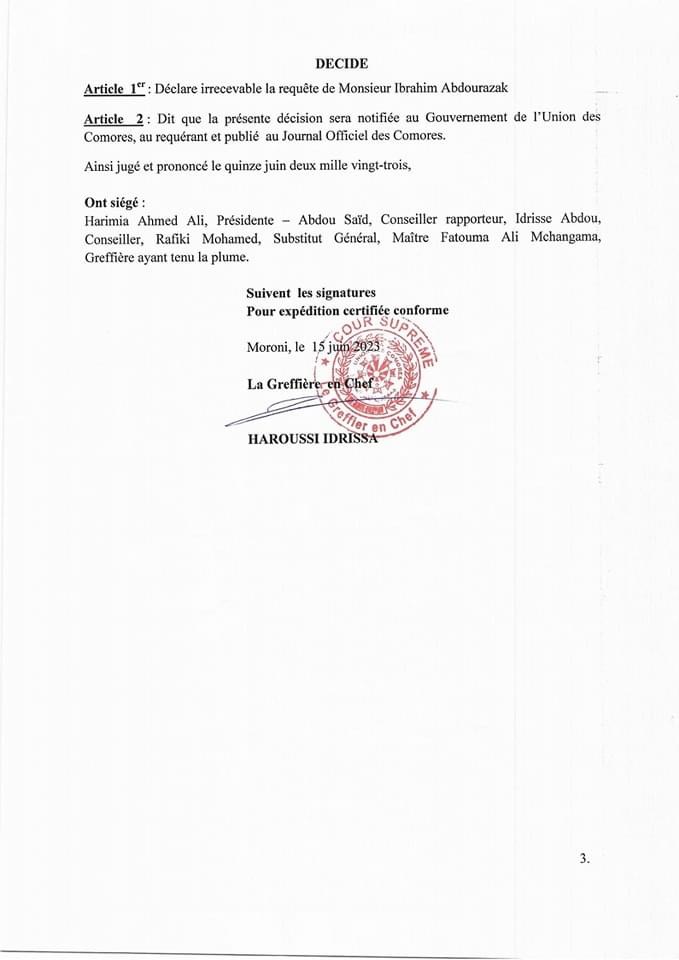 La requête déposée par le Front Commun a été examinée avec diligence par la Section Constitutionnelle de la Cour Suprême. Après une analyse approfondie des arguments présentés par les deux parties, la Cour Suprême a décidé de rejeter la requête, arguant qu’il n’existait pas suffisamment de preuves pour prouver une trahison de la part du Président Azali Assoumani.