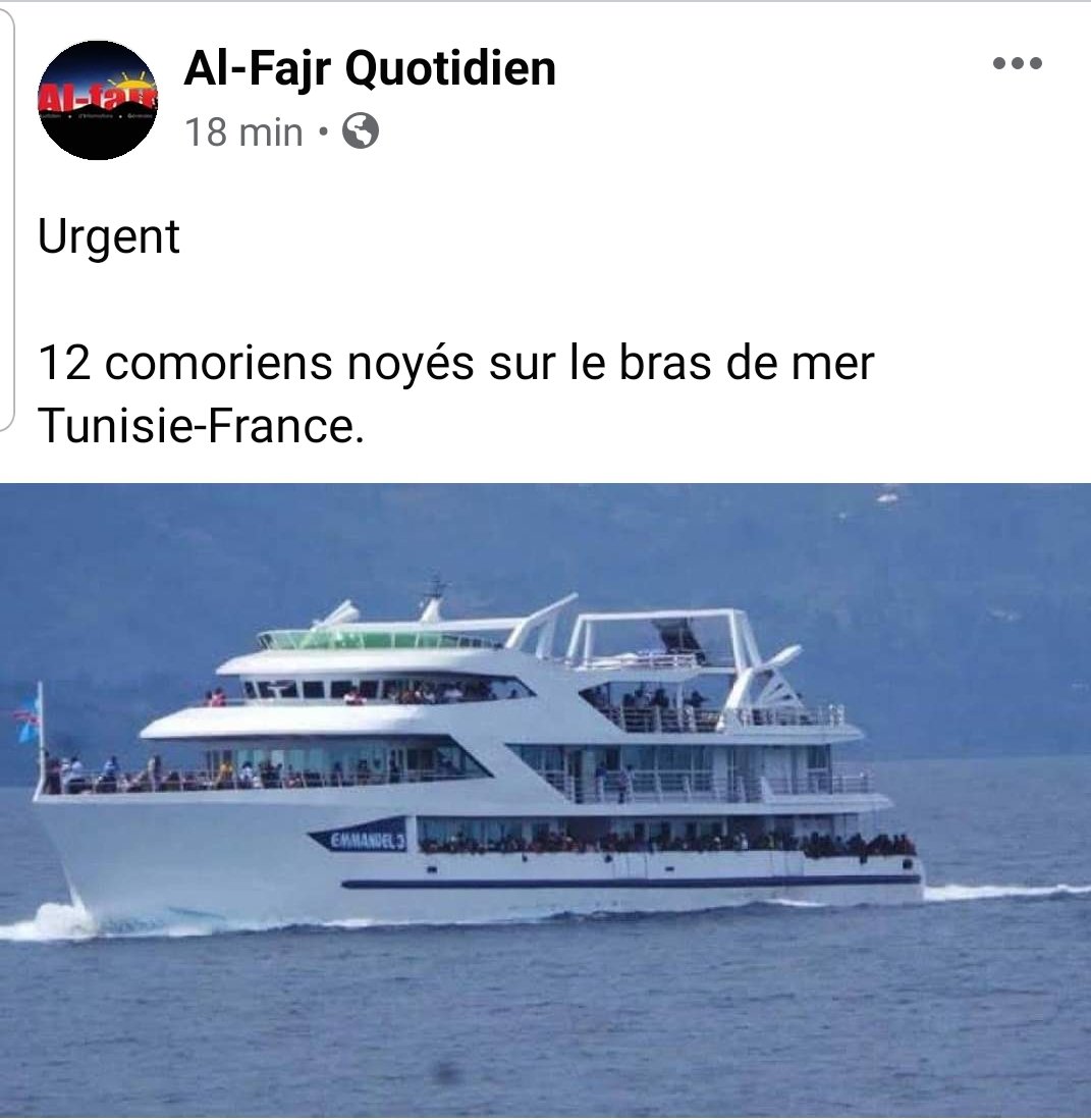 Flash info: Il y’aurait 12 Comoriens qui auraient perdu la vie le rapporte le journal Al-Fajr. Le quotidien précise que 12 comoriens se sont noyés sur le bras de mer Tunisie-France.
