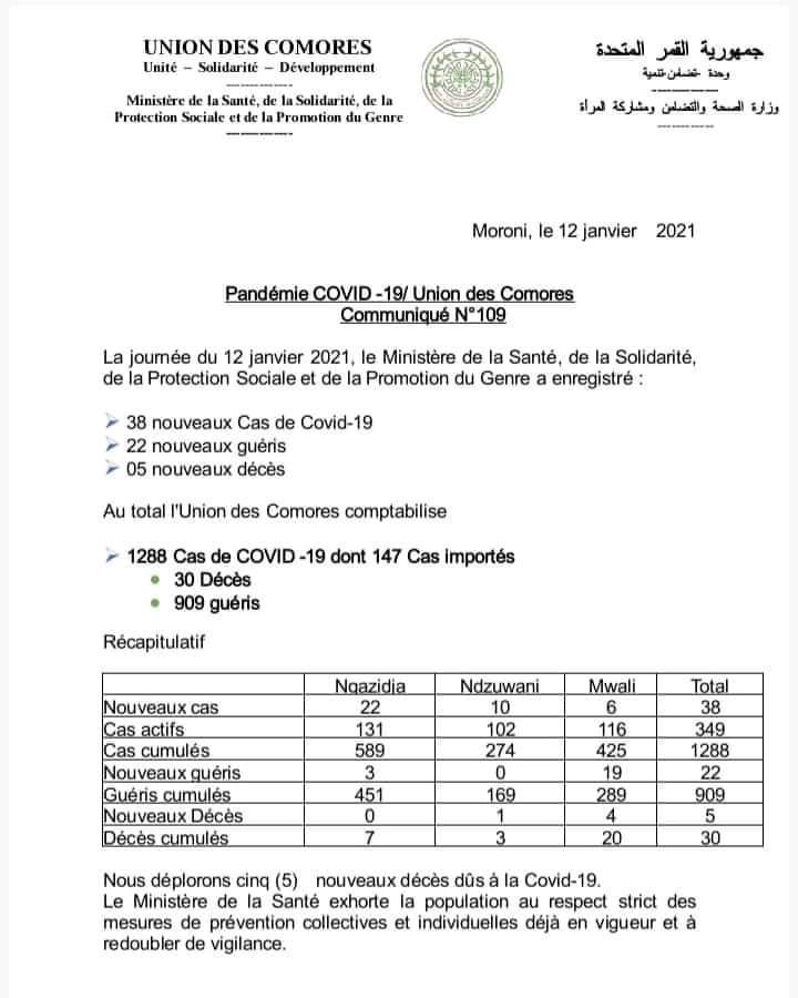 138 nouveaux cas positifs en trois jours. 5 personnes dont 4 à Moheli et 1 à la grande Comores ont perdu la vie. 30 décès au total dans les trois îles. 22 personnes sont déclarées guéries ces dernières 24h. Les autorités sanitaires appellent au respect des mesures barrières de lutte contre le Coronavirus notamment le lavage régulier des mains, le port du masque et la distanciation sociale
