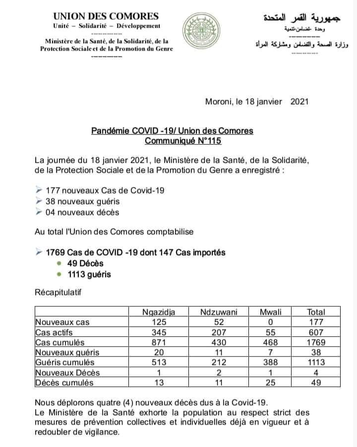 Le ministère de la santé vient de sortir le bulletin de santé du jour. Pour la première fois, les 3 îles indépendantes des Comores viennent d’enregistrer 177 nouveaux cas positifs de COVID-19 dont 125 à la grande Comores, 52 à Anjouan et 0 à Moheli en moins de 24heures. Au total, 1769 cas sont enregistrés depuis le début de la pandémie jusqu’aujourd’hui. 607 cas positifs dont 345 à Ngazidja, 207 à Anjouan et 55 à mwali restent actifs. 4 nouvelles personnes, dont 2 à Ndzuani, 1 à Ngazidja et 1 à moheli sont décédées ces dernières 24 heures. 49 décès sont enregistrés depuis le début de l’épidémie jusqu’aujourd’hui.