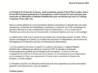 COMMUNIQUE DE PRESSE CONJOINT Paris le 23 janvier 2019 Le Président de l’Union des Comores, Azali Assoumani, premier Chef d’État à rendre visite à la nouvelle Secrétaire générale de la Francophonie, a saisi l’occasion de […]