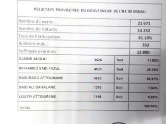 Les résultats provisoires sur l’élection du gouverneur de l’île d’Anjouan. Anissi Chamsoudine est élu gouverneur selon les résultats provisoires de la CENI. L’ile tourne définitivement la page. La mouvance a écrasé l’opposition.