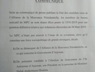 Le choix du candidat au poste de gouverneur d’Anjouan divise sur l’île. Le mouvement pour les Comores conteste le choix de la mouvance présidentielle et présente un candidat au poste de Gouverneur.