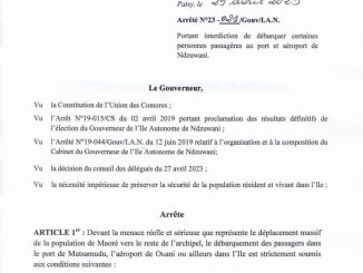 Le gouverneur de l’île autonome de Ndzuwani, Anissi Chamsidine, a publié un arrêté interdisant le débarquement de certaines personnes au port et à l’aéroport de Ndzuwani. Cette mesure fait suite à la menace que […]