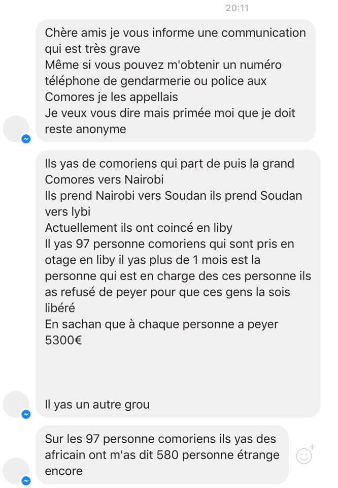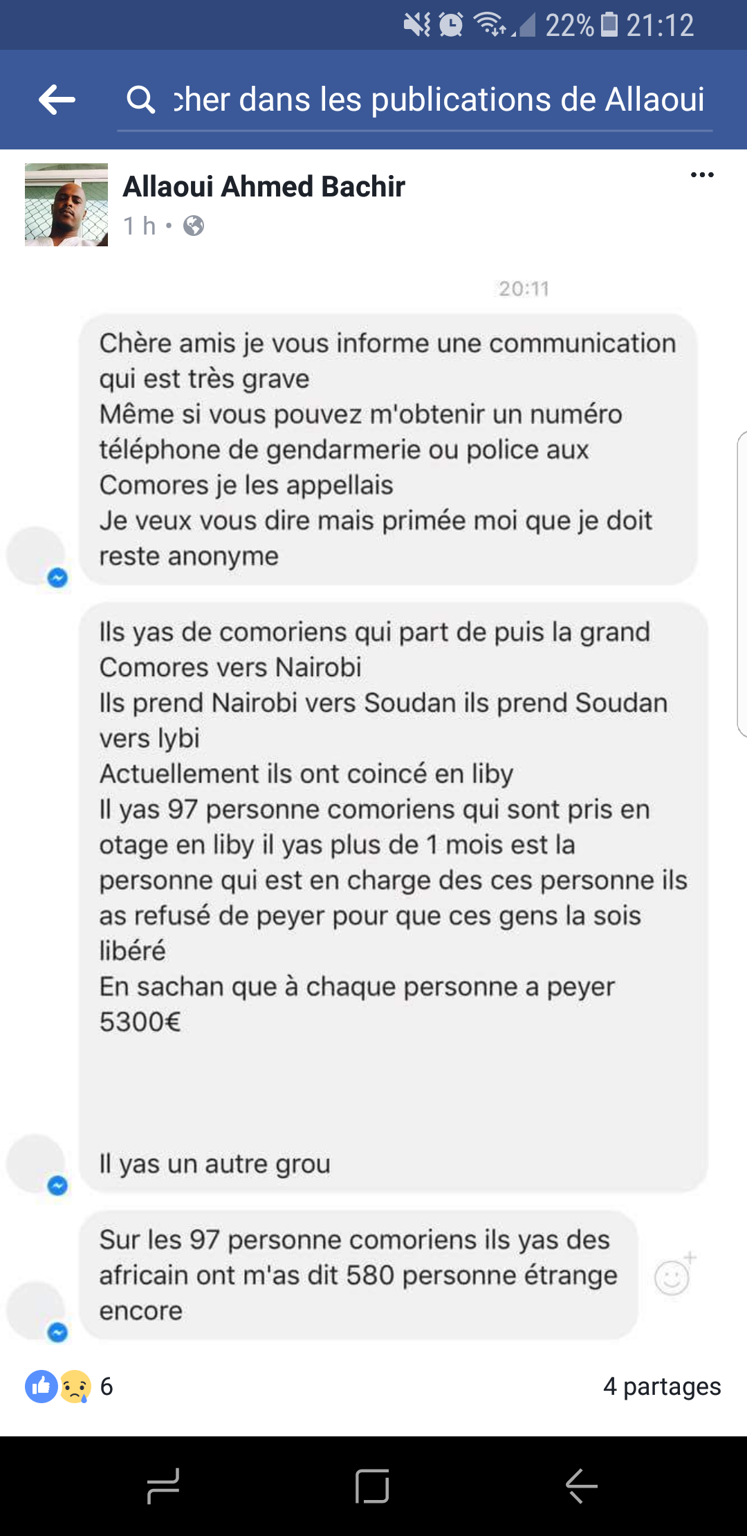 Le directeur de la radio et télévision d’Anjouan, Allaoui Ahmed Bachir a publié un message reçu en privé sur Facebook qui appelle les autorités compétentes à aller secourir des Comoriens retenus en otages en Libye.