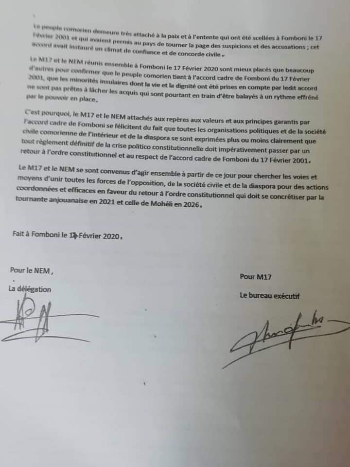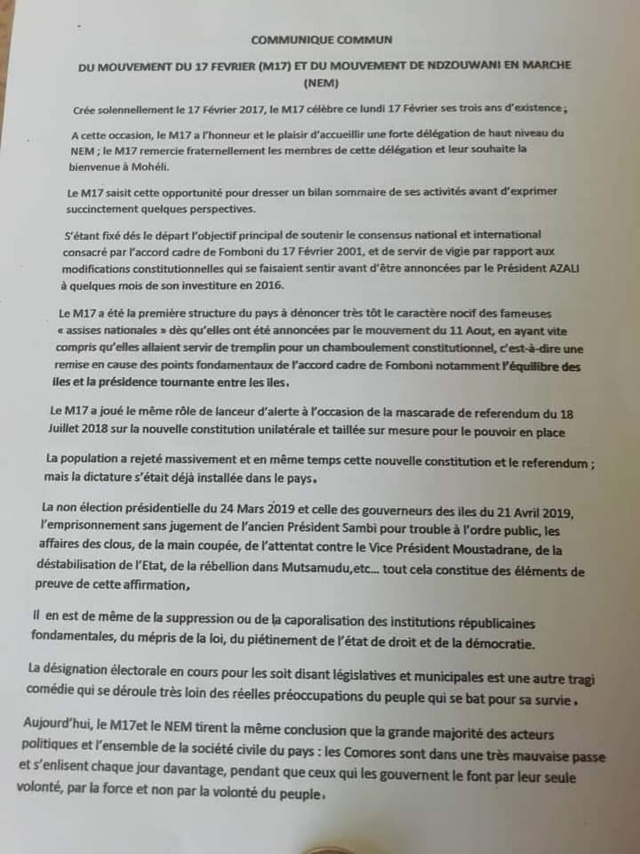 A Moheli, le M17 a reçu une délégation de Ndzuwani En Marche (NEM) au domicile de M. Archadi M. Madi, ancien Gouverneur, l’après-midi de ce lundi 17 février.