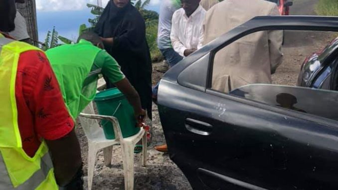 A l’entrée de Tsinimoipanga, tous les véhicules doivent s’arrêter, les passagers invités à descendre, laver les mains à l’eau de javel et prendre une solution hydro alcoolique avant l’accès au village.Med Youssouf