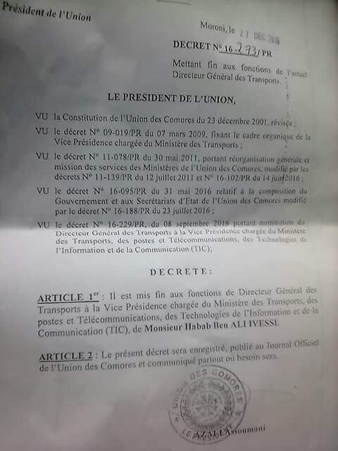 Habib Ipvessi le directeur des transports aux Comores est limogé. Il est l’auteur de la lettre de suspension des vols Air Austral et Ewa Air du 26 décembre dernier.