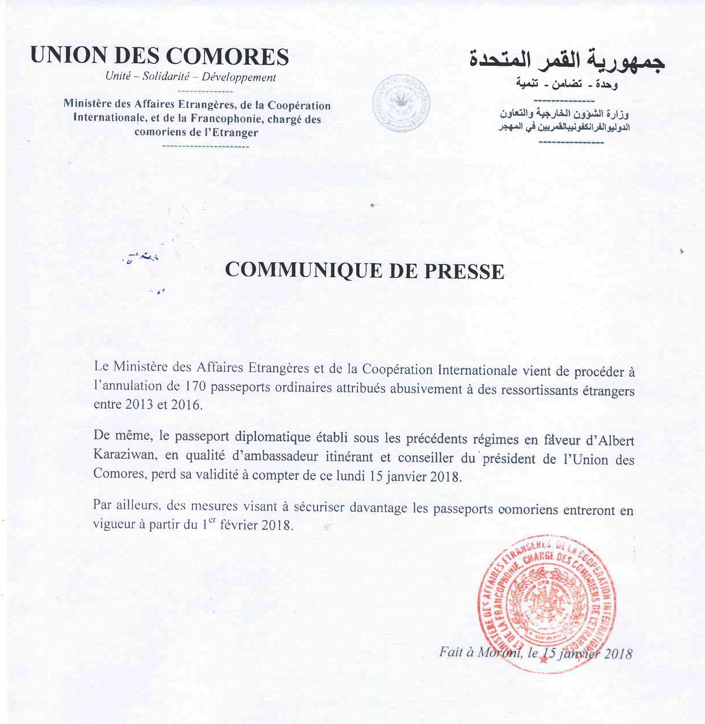 Il apparaît qu’outre Emmanuel Adrupiako, au cœur du scandale congolais, deux Iraniens considérés par les Etats-Unis l’un comme un trafiquant de matériel militaire, l’autre comme un affairiste en blanchiment d’argent ont obtenu un droit d’entrée (ou de fuite) aux Comores. Dans un communiqué de son ministère des Affaires étrangères, daté du 15 janvier, l’Union des Comores a annoncé « des mesures visant à sécuriser davantage les passeports comoriens ».