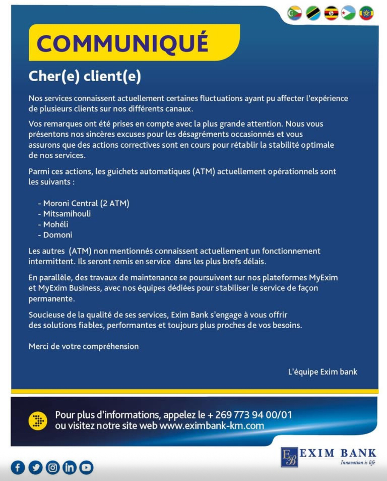 Alors que de nombreux clients d’EXIM Banque expriment leur ras-le-bol, AFG Banque semble tirer son épingle du jeu. Les GAB d’EXIM, souvent en panne — près de la moitié du temps selon certains usagers —, obligent encore trop de clients à faire le tour de Moroni pour retirer de l’argent. À cela s’ajoutent les problèmes persistants de l’application mobile, devenue inutilisable pour beaucoup depuis sa dernière mise à jour.