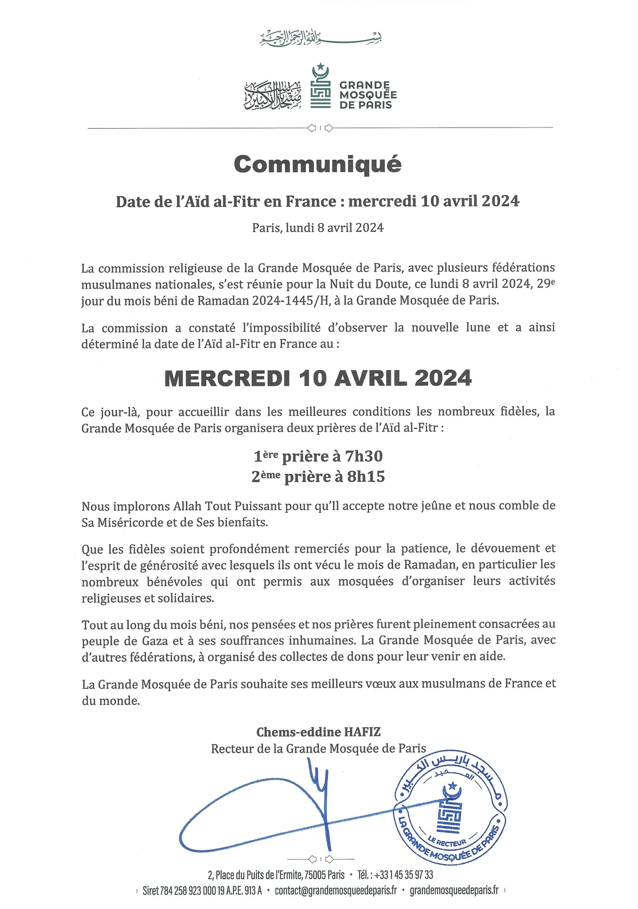 France. Ce lundi 8 avril a marqué une journée importante pour la communauté musulmane, alors que la Grande Mosquée de Paris a confirmé que la fin du mois de jeûne du ramadan serait observée deux jours plus tard. Cette annonce fait écho à celle de l’Arabie saoudite, terre sainte de l’islam, qui a déclaré que l’Aïd el-Fitr, la fête de la rupture du jeûne, débuterait mercredi.