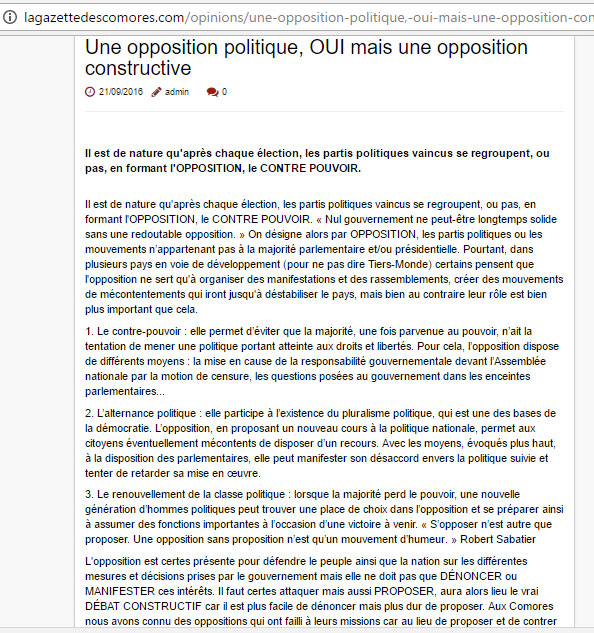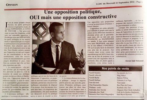 Voici l’article de La Gazette des Comores : http://lagazettedescomores.com/opinions/une-opposition-politique,-oui-mais-une-opposition-constructive.html