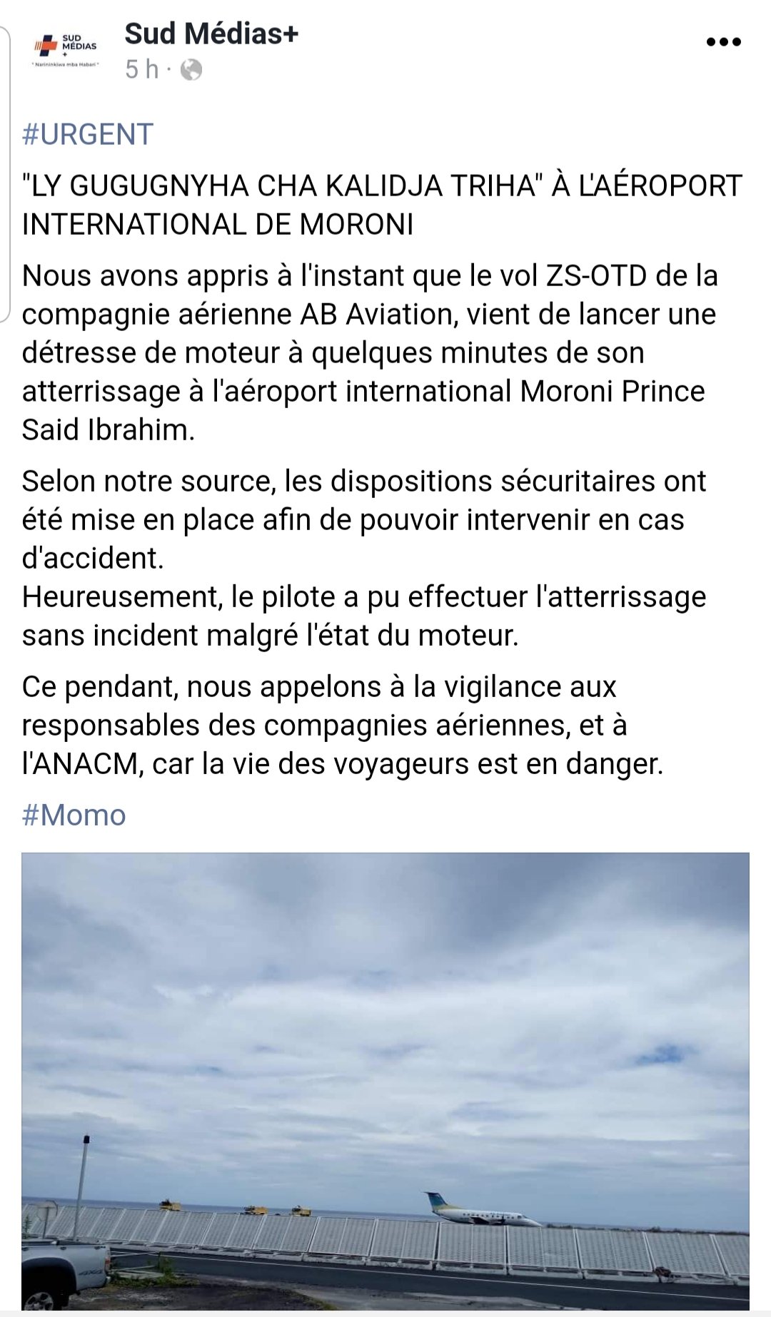 Une fausse information a été partagée sur les réseaux sociaux faisant croire qu’un avion d’AB aviation a eu un problème de moteur lors de l’atterrissage à l’aéroport de Hahaya. Cette information est complètement fausse. Il s’agit d’une information visant à porter atteinte à l’image de la compagnie. La direction de la compagnie aérienne compte porter plainte.