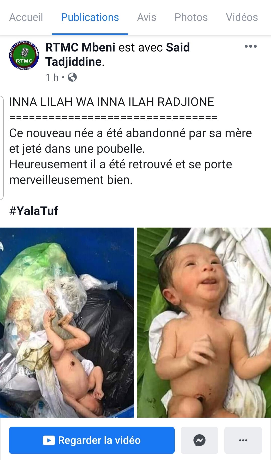 Les images qui circulent montrant un enfant abandonné dans une poubelle, cette scène ne s’est pas déroulée aux Comores. Nos confrères de RTMC n’ont jamais écrit que c’était aux Comores contrairement à la rumeur sur les réseaux sociaux.