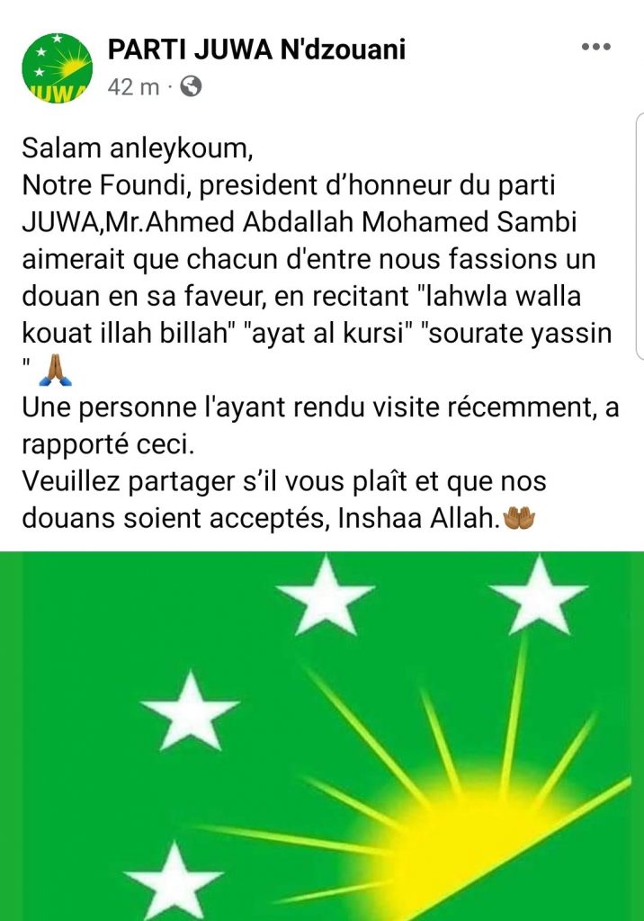 En prison depuis de 4 ans, l’ancien président Ahmed Abdallah Sambi demande à ses partisans de lui faire un douan comme le rapporte le parti Juwa :