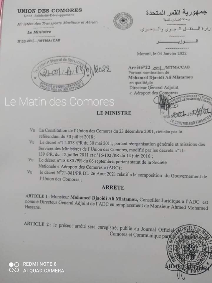 Mohamed Djaoide Ali Mlatamou Précédemment Conseiller Juridique de la Société Adc est nommé Directeur Général Adjoint des Aéroports des Comores.
