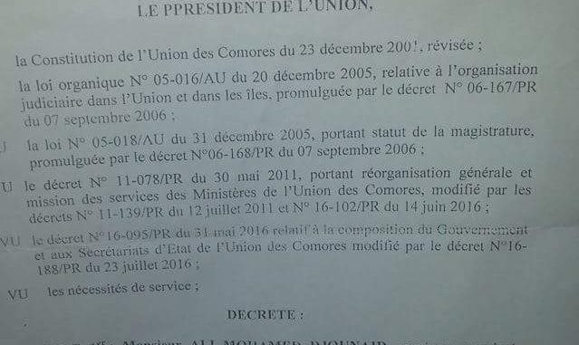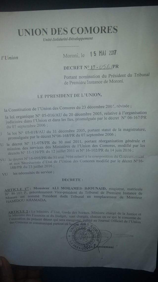 Ali Mohamed Djounaid est nommé président du tribunal ce 15 mai. Le juge Ali Mohamed Djounaid avait envoyé en prison plusieurs hommes politiques dont Houmedi Msaidié, Barwane et Abdou Soeuf.