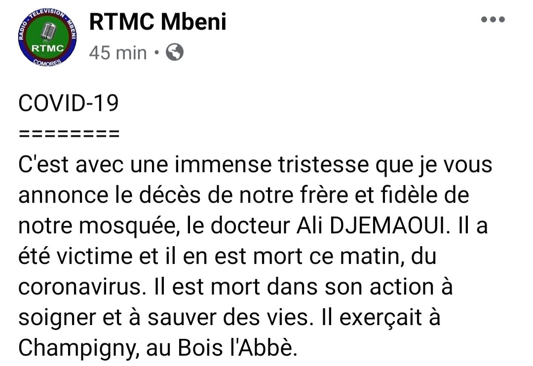 C’est avec une grande tristesse qu’on vous annonce le décès le docteur Ali DJEMAOUI. Il a été victime et il en est mort ce matin, du coronavirus. Il est mort dans son action à soigner et à sauver des vies. Il exerçait à Champigny, au Bois l’Abbè en région parisienne.