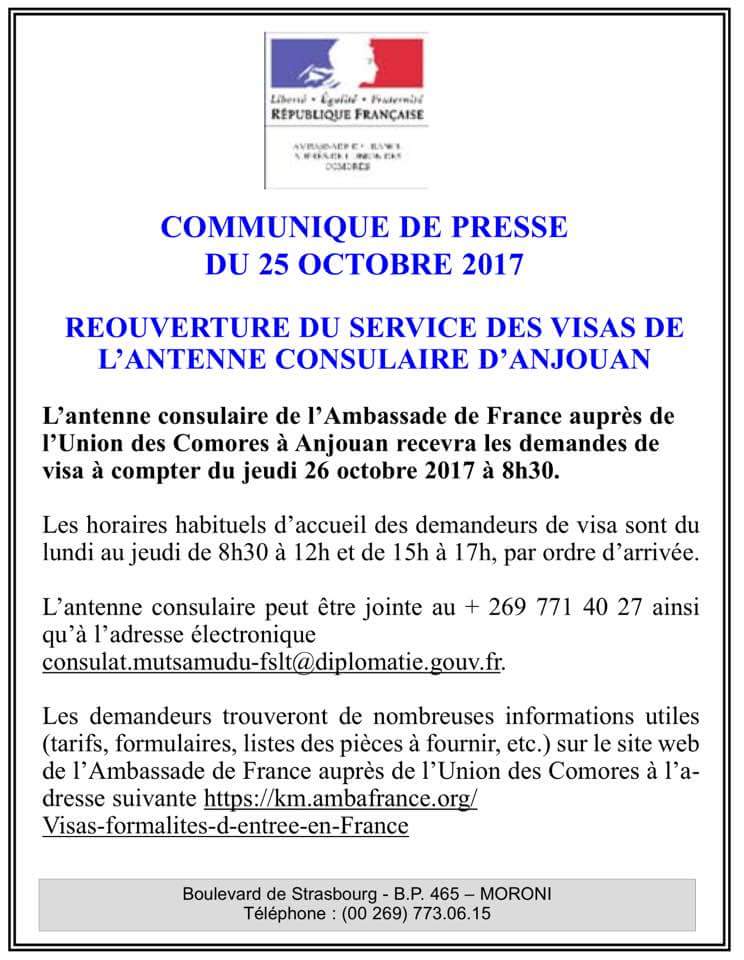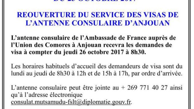 Le service des demandes des visas de l’ambassade de France à Anjouan est désormais ouvert. Les anjouanais n’ont plus besoin de se rendre à Moroni pour demander le visa pour la France ou Mayotte….
