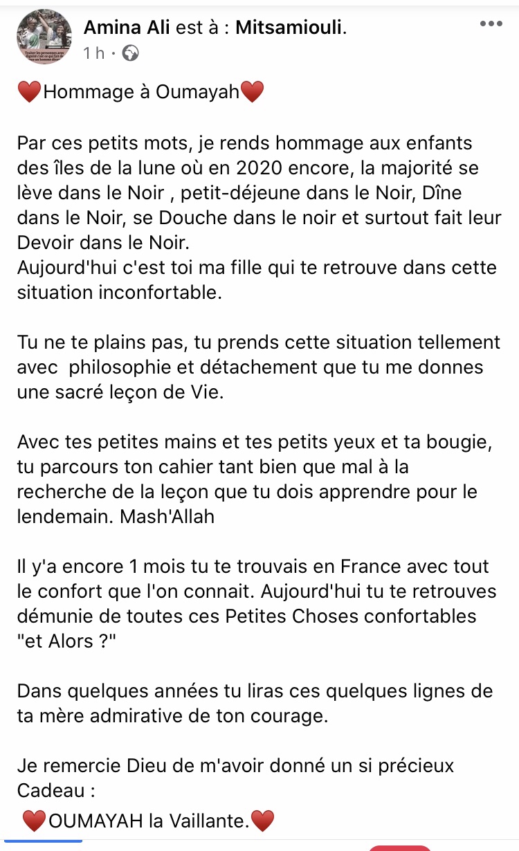 Elle est impressionnée par la capacité de sa fille née en France à s’adapter aux dures conditions de l’archipel des Comores. Rentrée de Paris le 20 août dernier avec sa fille pour rejoindre son mari de journaliste Oubeidillah Mchangama, Amina Ali suit attentivement le comportement d’Oumaya dans un pays où la fourniture de l’électricité est sporadique, surtout au Nord de Ngazidja où habite la petite famille. La maman, une grande gueule connue sur les réseaux sociaux, a réalisé ô combien sont tenaces les habitants des îles de la lune à qui elle rend d’ailleurs un vibrant hommage. « Aujourd’hui c’est toi ma fille qui te retrouve dans cette situation inconfortable. Tu ne te plains pas, tu prends cette situation tellement avec philosophie et détachement que tu me donnes une sacré leçon de Vie », s’impressionne cette militante, membre de l’association Ufahari Wa Komori. Elle poursuit : « Il y’a encore 1 mois tu te trouvais en France avec tout le confort que l’on connait. Aujourd’hui tu te retrouves démunie de toutes ces Petites Choses confortables « et Alors ? » ». Alors on n’a qu’à faire avec car à cœur vaillant rien d’impossible.