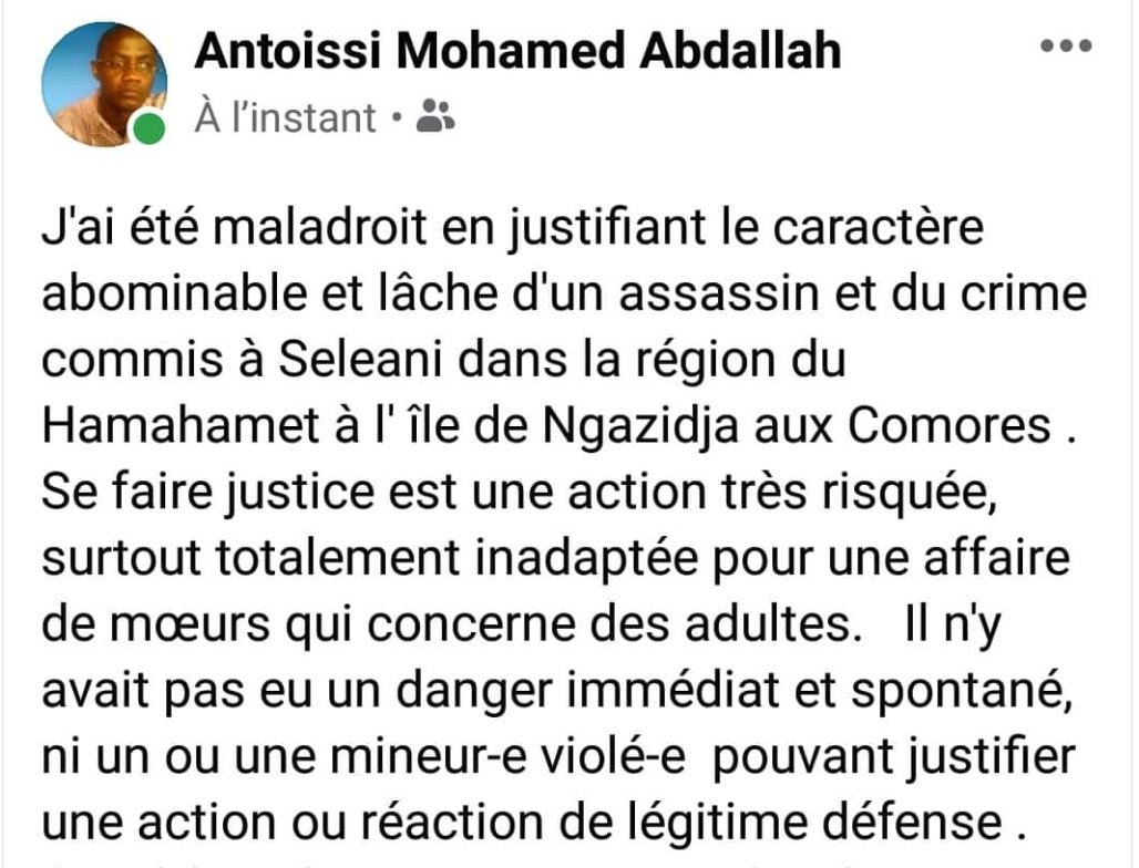 Suite à l’assassinat de Athoumani Mouminu qui aurait entretenu depuis plusieurs années avec la femme de son assassin; Antoissi avait clairement soutenu Hadji Ahamada, le tueur de l’amant de sa femme. Il revient sur ses propos après une vive émotion des internautes qui ont condamné sa prise de position.