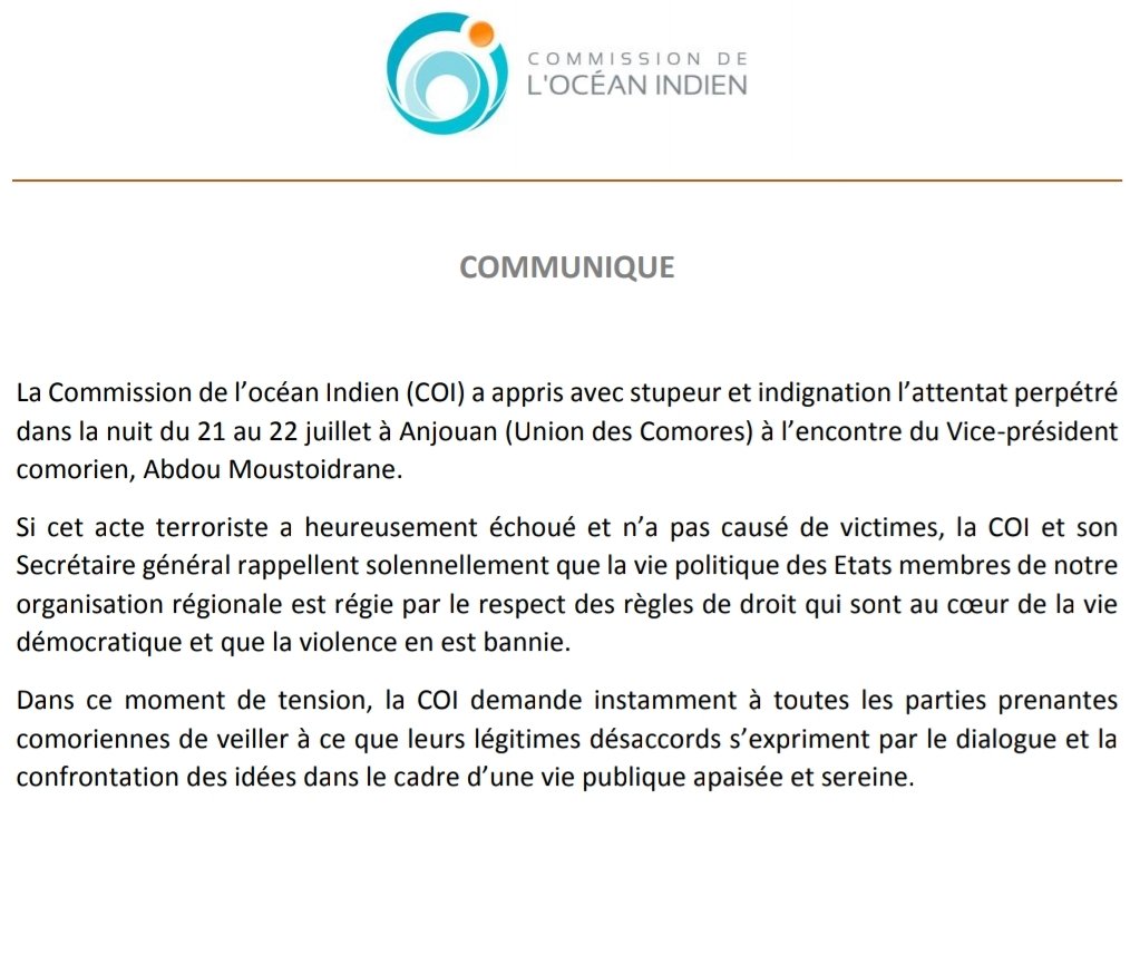 La Commission de l’océan Indien (COI) a appris avec stupeur et indignation l’attentat perpétré