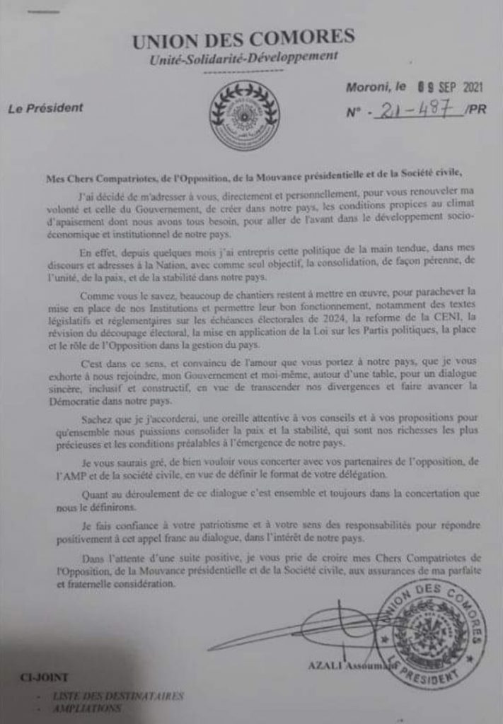 Le président Azali Assoumani adresse officiellement un courrier aux acteurs politiques et à la société civile pour un dialogue national. L’opposition va t-elle saisir la main tendue d’Azali ?