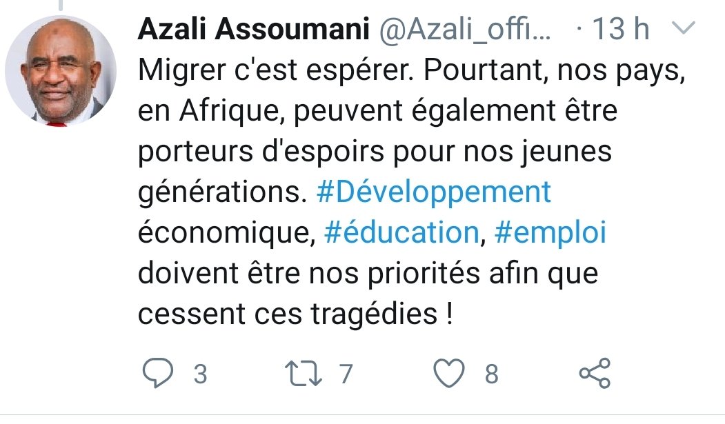 « Migrer c’est espérer. Pourtant, nos pays, en Afrique, peuvent également être porteurs d’espoir pour nos jeunes générations. Développement économique, éducation et emploi doivent être nos priorités afin que cessent ces tragédies. », Azali