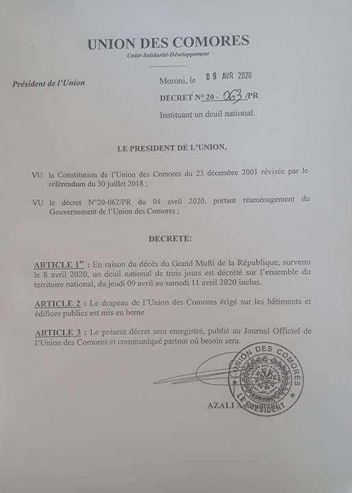 Le grand Mufti de la République est décédé hier mercredi dans la soirée et enterré ce jeudi. Le chef de l’Etat Azali Assoumani vient de décréter trois jours de deuil national. Le drapeau national sera en berne durant ces 72h.