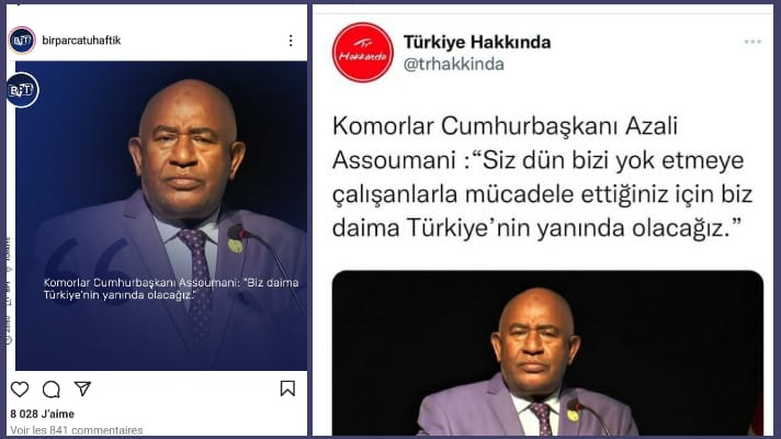 Un clown reste un clown, Azalı fait la UNE des médias satiriques turcs. İl avait déclaré lors du sommet Afrique-Turquie que «NOUS serons toujours derrière la Turquie» . Le lendemain, le dollar a chuté pour la première fois depuis 4 mois au profit du livre turque . Les médias satiriques turcs ironisent que c’est grâce au soutien manifesté par Azali que la Turquie a eu un tel succès. Tous les médias satiriques s’en moquent et les Comores deviennent la risée des turques sur Twitter.