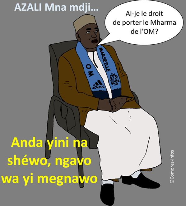 Dessin satirique. Vous risquez la prison si vous dites qu’Azali est un Mna Mdji ou Gouzzii. Un journaliste est actuellement en prison pour avoir dit la vérité sur la situation du président. Si vous partagez cet article vous risquez peut être la prison.