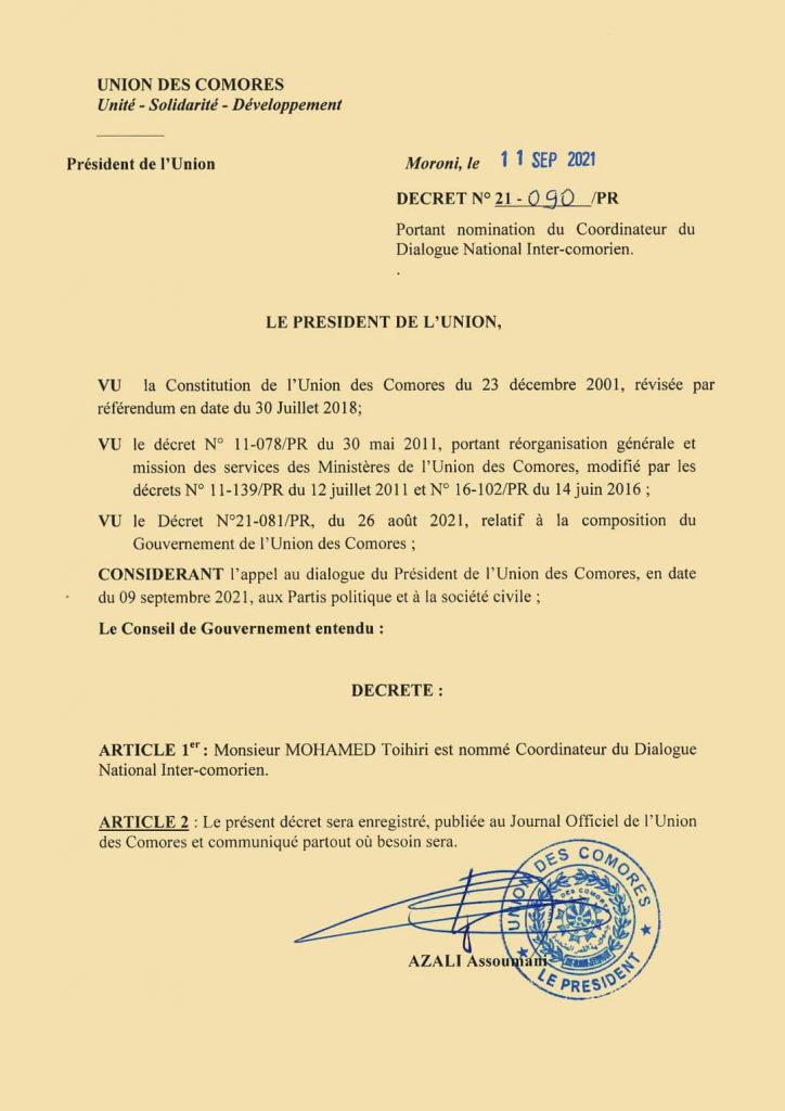 L’arrivée de la délégation de l’union africaine pousse Azali a accéléré le dialogue avec l’opposition. Portant nomination du Coordinateur du Dialogue National Inter-comorien. Dans quelques jours une commission sera sûrement mise en place.