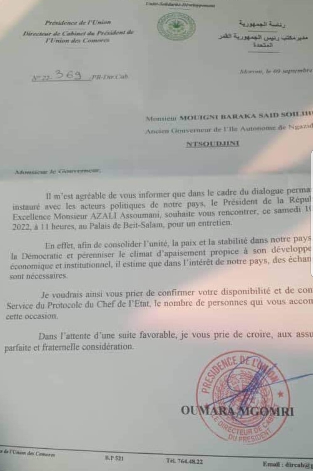 Le président Azali Assoumani pourrait rencontrer l’ancien gouverneur de Ngazidja, Mouigni Baraka Saïd Soilihi. Une rencontre pour un apaisement politique.