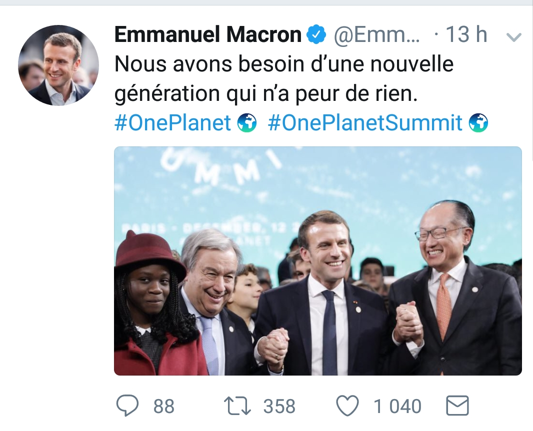 Ce mardi se tenait à l’île Seguin, en région parisienne, le One Planet Summit consacré à la finance verte, pour les deux ans de l’Accord de Paris. Dans la photo postée par le président Macron, Azali a tout simplement été supprimé. Ils étaient 5 sur la photo initiale mais Azali n’apparaît pas sur la photo de Macron sur Twitter.