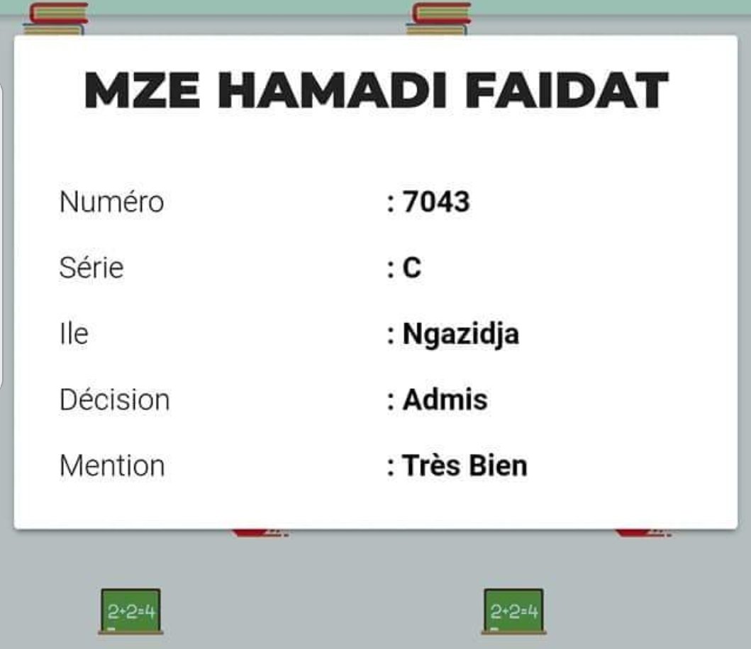 MZE HAMADI FAIDAT âgée de 16 ans, c’est la très jeune bachelière qui a eu le bac C avec la mention très bien et qui a également eu les félicitations du jury. Avec un excellent niveau scientifique depuis son jeune âge, ses professeurs avaient remarqué son niveau et ses résultats.