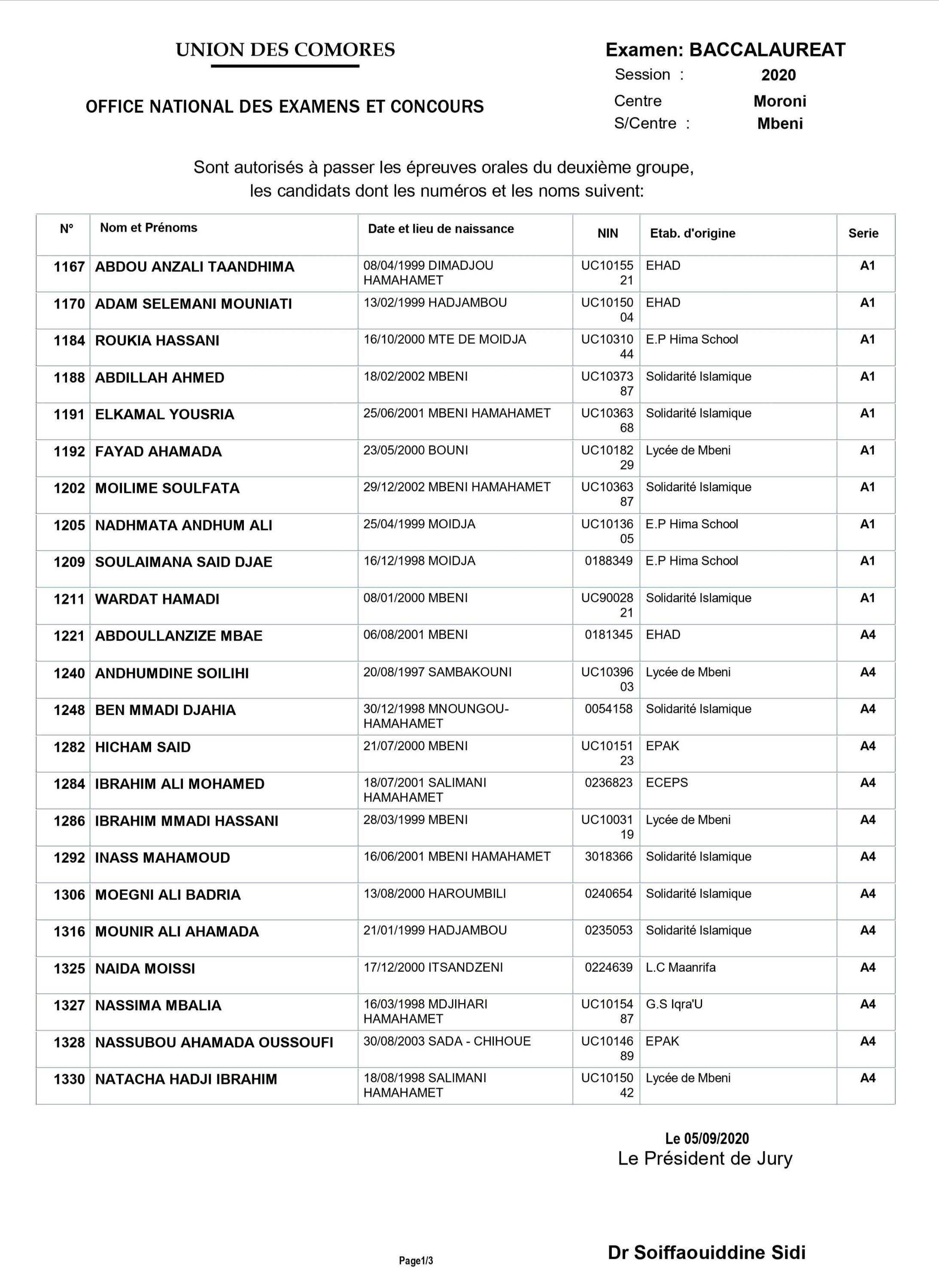 Voici les résultats du Baccalauréat 2020:Centre de Moroni.Suite des résultats à Mbéni:Résultats à Foumbouni :