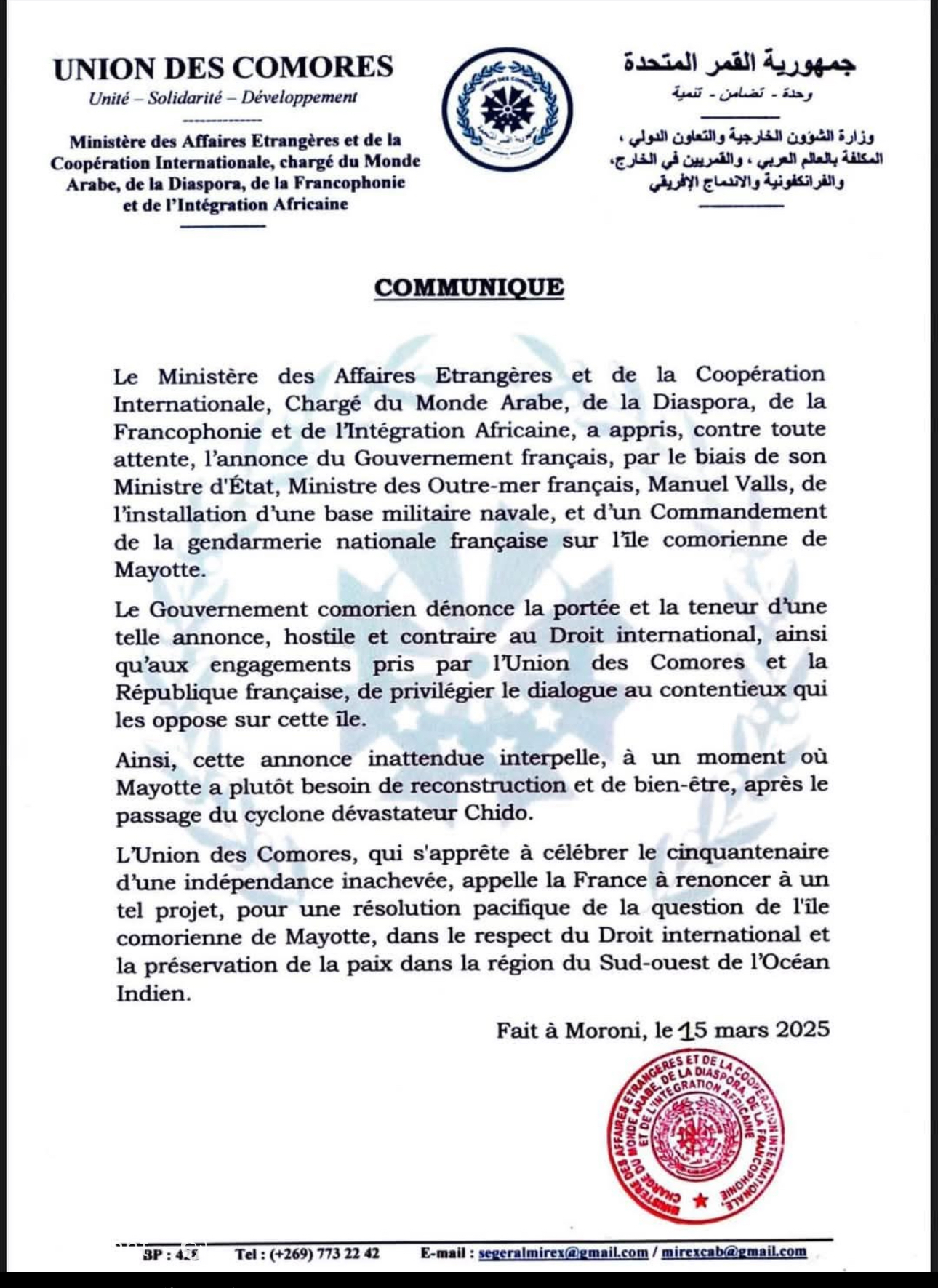 Base militaire à Mayotte : communiqué du gouvernement comorien