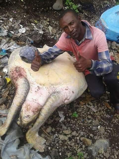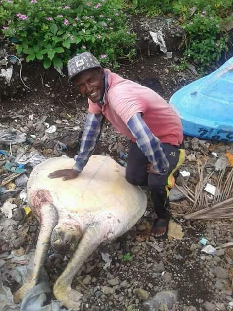 Il tue une tortue et il pose fièrement avec l’animal protégé. La tortue est un animal protégé dans notre pays et le monde entier. Aux Comores les braconniers continuent de tuer les tortues et de poster des photos sur les réseaux sociaux. Un braconnier qui devrait être arrêté par la police. Tu es des tortues est un crime. N’hésitez pas à signaler à la police si vous connaissez cette personne.
