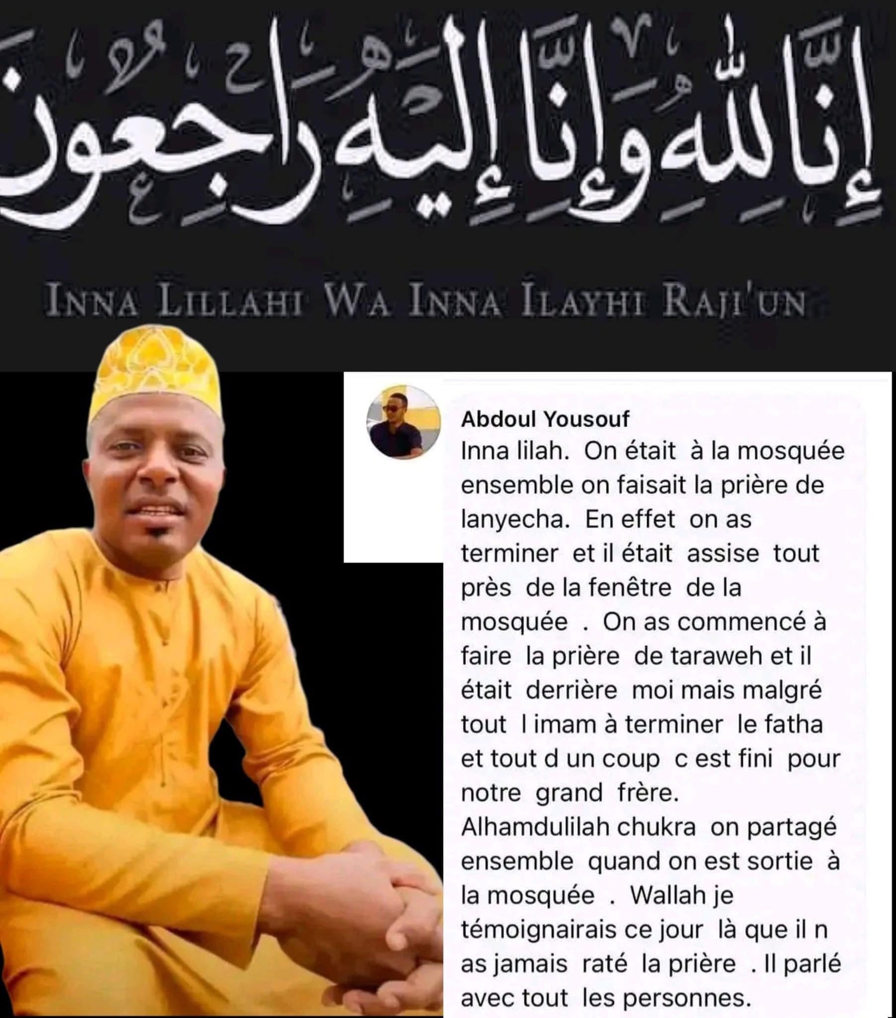 Ce vendredi soir, au sixième jour du mois sacré de Ramadan aux Comores , Ibrahim Abdou Chakour, connu sous le nom d’Ibrahim Makine, a rendu son dernier souffle en pleine prière de Tarawih, au sein de la mosquée de Maoueni ya Mboudé. Son décès soudain a bouleversé tout le village , qui se souvient d’un homme exemplaire, respecté et aimé de tous.