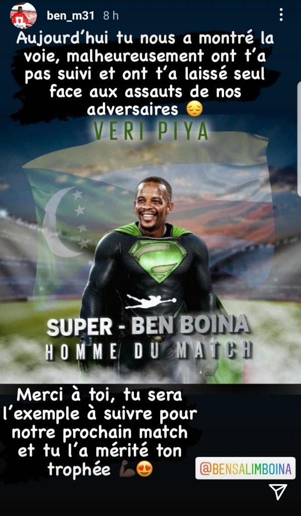 C’est un message de félicitations et de reconnaissance que Ben El Fardou a adressé à son coéquipier des Coelacanthes. Un message posté sur le story de Ben El Fardou sur Instagram.