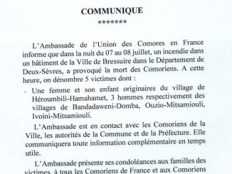 L’ambassade des Comores à Paris a indiqué dans un communiqué publié ce 8 juillet en première partie de soirée qu’au moins 5 compatriotes, dont une femme et son enfant, ont perdu la vie dans un violent incendie qui s’est déclenché […]