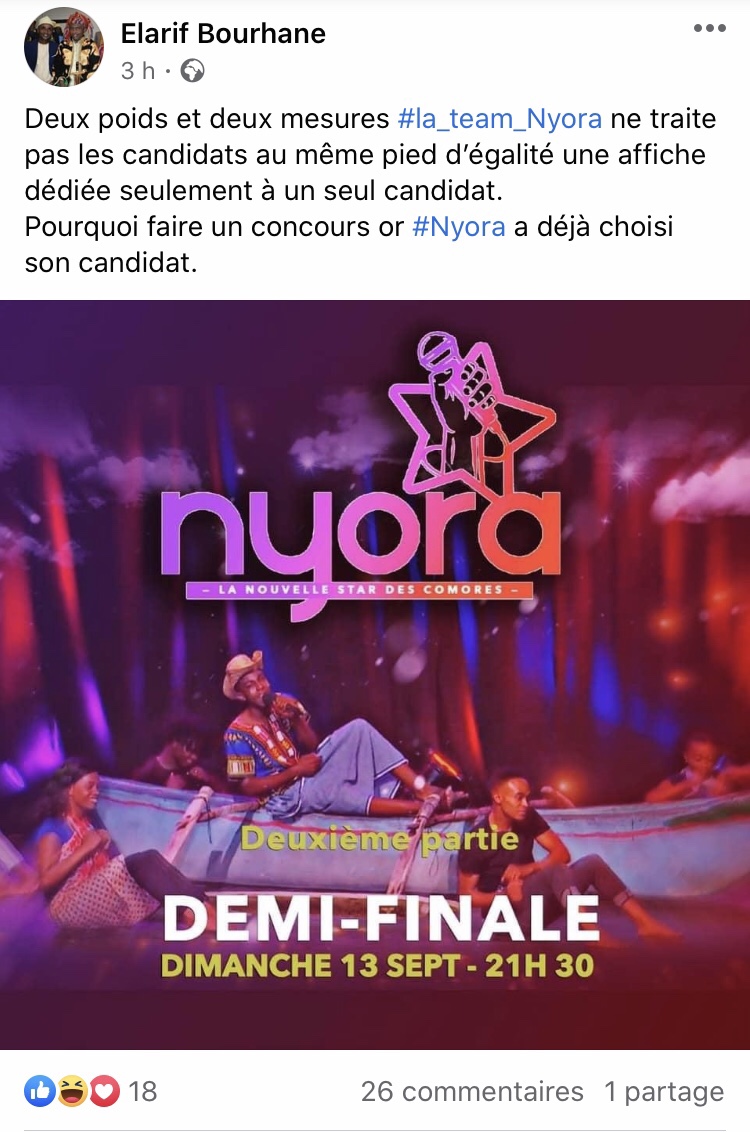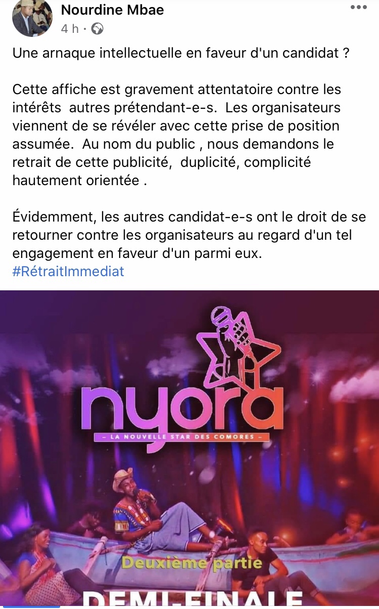 Les internautes dénoncent une affiche du concours Nyora dédié à la musique et organisé par Comores Telecom. En effet cette affiche met en premier plan Fahid Le Bled’Art, le candidat qui a le vent en poupe.
