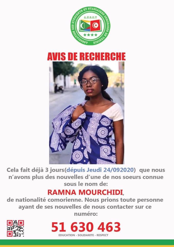 La communauté comorienne en Tunisie se mobilise pour la recherche de Ramna Mourchidi, qui n’a pas donné de ses nouvelles depuis le jeudi 24 septembre. Ses collègues ont lancé un avis de recherches👇.