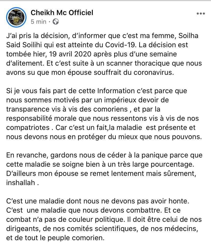J’ai pris la décision, d’informer que c’est ma femme, Soilha Said Soilihi qui est atteinte du Covid-19. La décision est tombée hier, 19 avril 2020 après plus d’une semaine d’alitement. Et c’est suite à un scanner thoracique que nous avons su que mon épouse souffrait du coronavirus.