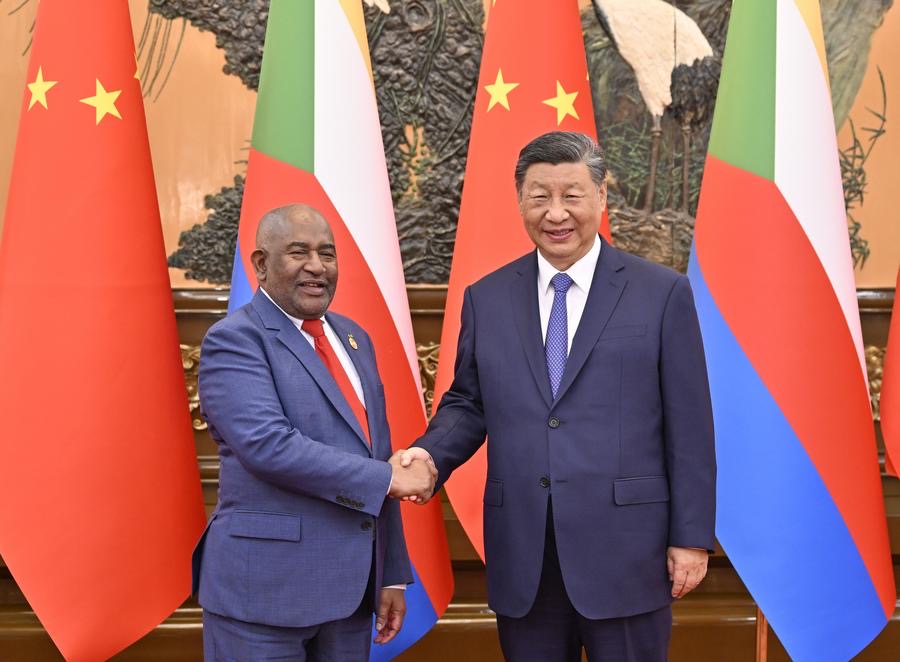 (240902) -- BEIJING, Sept. 2, 2024 (Xinhua) -- Chinese President Xi Jinping meets with Comorian President Azali Assoumani, who is in Beijing for the 2024 Summit of the Forum on China-Africa Cooperation (FOCAC), at the Great Hall of the People in Beijing, capital of China, Sept. 2, 2024. (Xinhua/Yin Bogu)