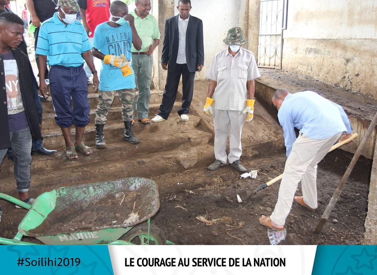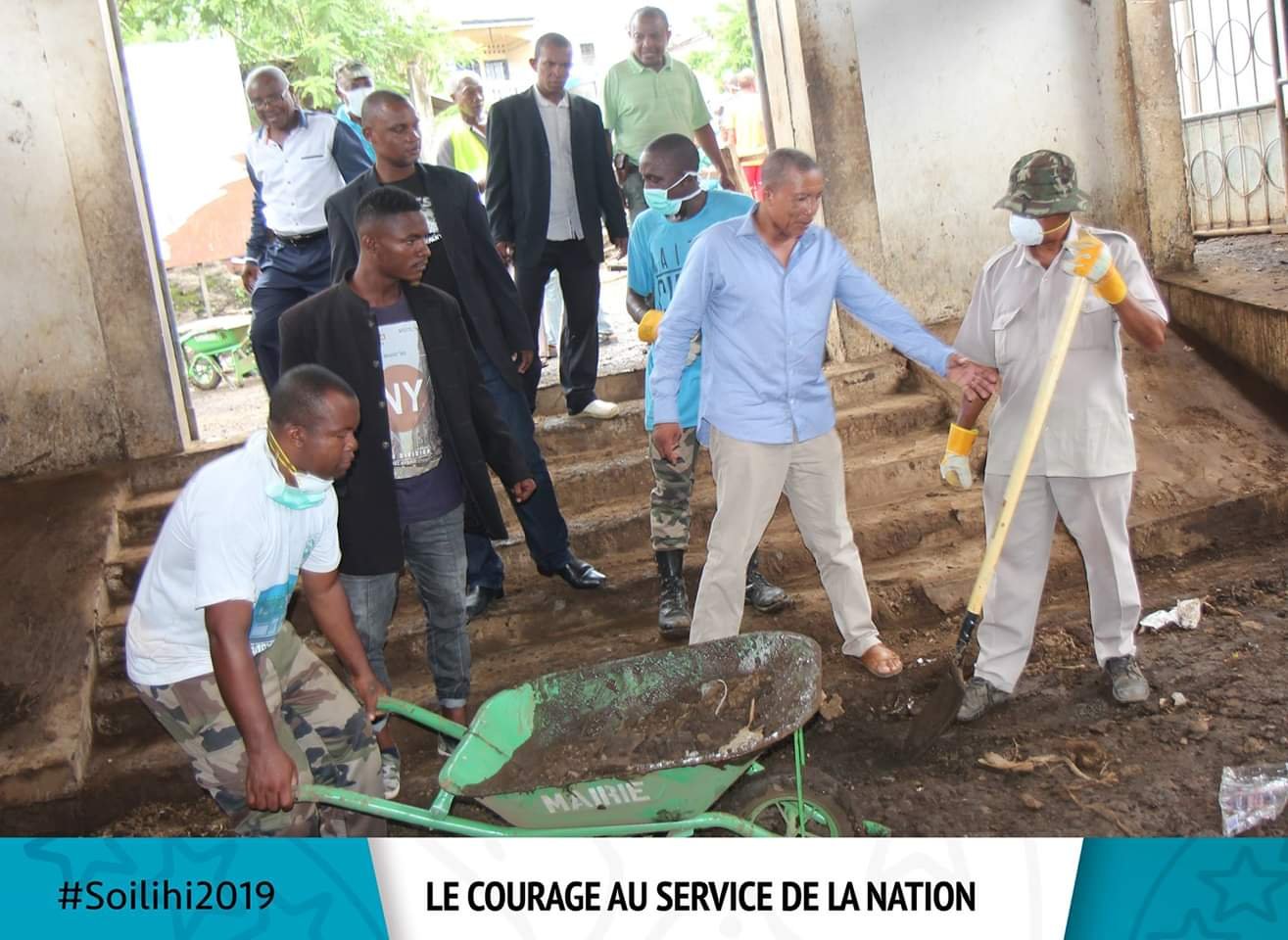 En tournée dans l’île d’Anjouan, le candidat Soilihi Mohamed ( Colonel Campagnard) a participé hier au nettoyage du marché de Domoni, fermé toute la semaine après les intempéries.