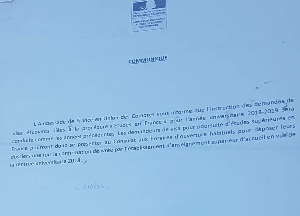 L’ambassade de France en Union des Comores vous informe que l’instruction des demandes de visa étudiants liées à la procédure « Études en France » pour l’année universitaire 2018-2018 sera conduite comme les années précédentes.